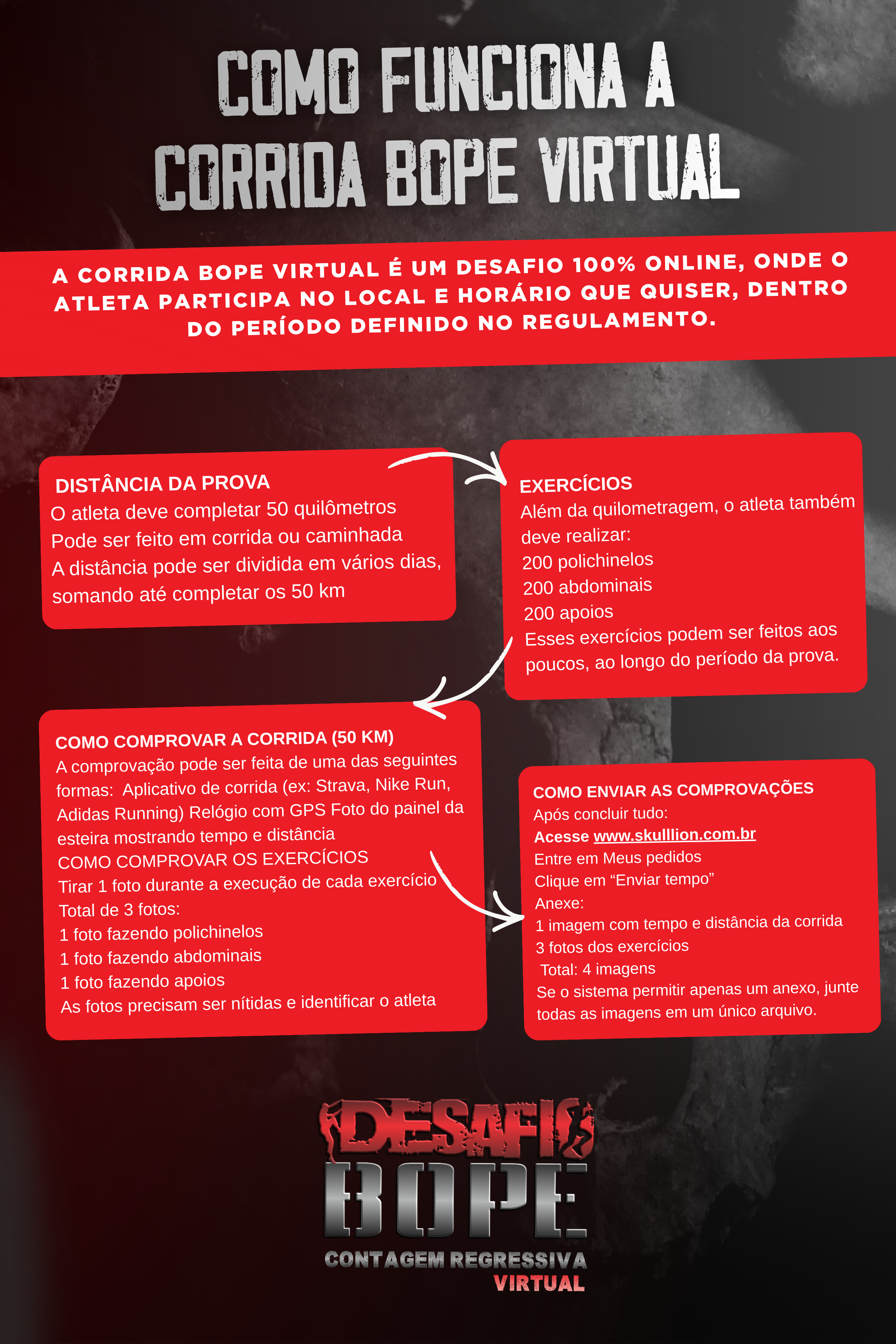 O Desafio BOPE CONTAGEM REGRESSIVA é uma prova virtual criada para quem carrega no peito a vontade de superar limites. Inspirado na disciplina, coragem e resistência dos operadores, este desafio coloca você frente a frente com sua própria evolução sem precisar estar em um evento presencial.